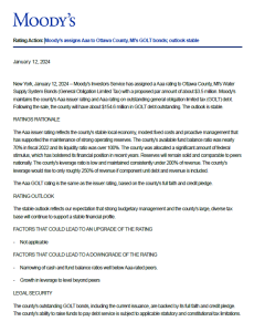 In great news for citizens, on January 12, 2024, Moody’s assigned a AAA bond rating to Ottawa County’s bond issuance, which is the highest possible rating. This continues the county’s excellent AAA bond rating and reflects the county’s strong financial position.