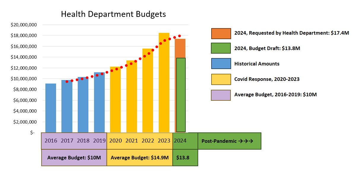 The current county proposal for FY24 Health Department expenditures is $13.8 Million, which is consistent with pre-pandemic expenditures adjusted for population growth and inflation. This amount is higher than the elevated pandemic expenditures of $13.4M in 2021 by the Health Department during the Covid response.